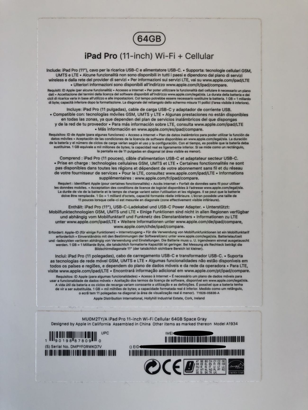 iPad Pro 11" con 64Gb de capacidad, conectividad Wifi + Cellular, color Gris espacial, comprado en Junio de 2019. Se acompañan Apple Pencil de la misma fecha, y fundas de la marca Torro (de piel) compradas en conjunto con el iPad. La funda del Apple Pencil se puede quedar imantada en la funda del iPad para mayor comodidad de transporte. Dado que se compró en Junio de 2019, dispone a la fecha de algo más de 1 año de garantía (se acompañan facturas de todo).