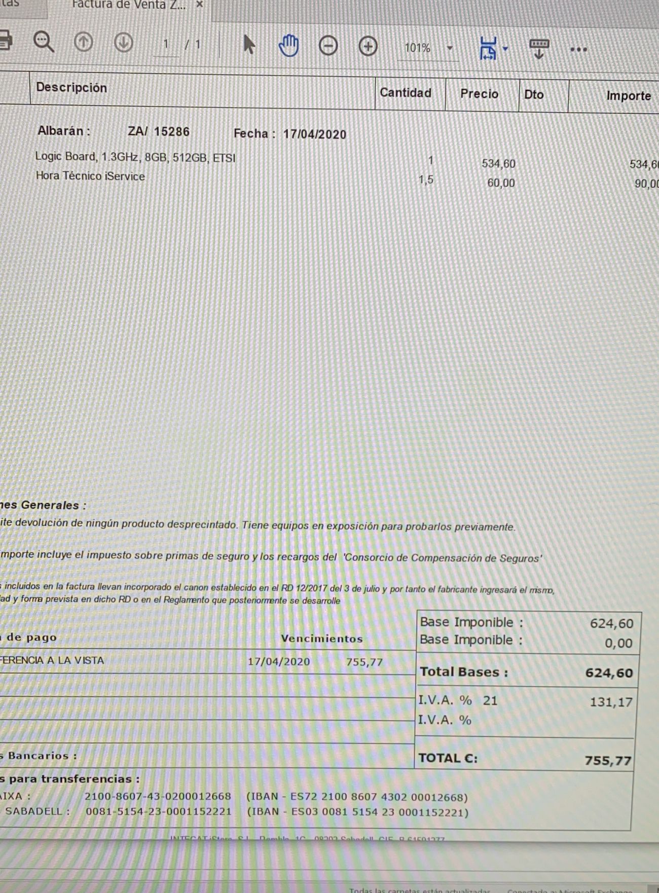 Se adjunta la factura de reparación por valor de 755 euros en servicio técnico oficial Apple como valor de garantía.