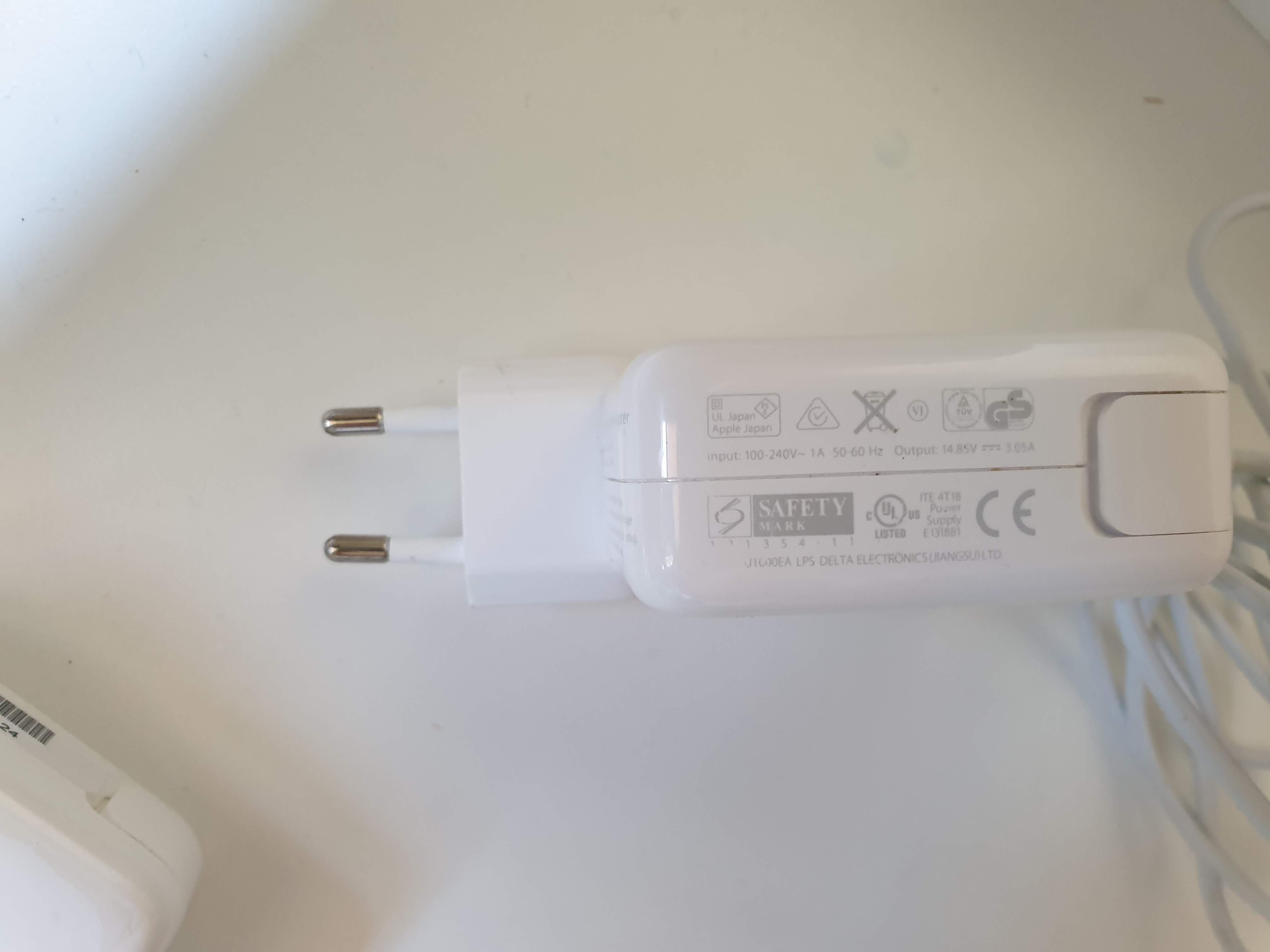 Como accesorios tiene otro cargador , que funciona perfectamente pero está sin utilizar, no original de Apple, ya que el original funciona, pero, como se observa en la foto, una de las clavijas está algo torcida. Además, incorpora dos adaptadores: de mini DVI a HDMI y de mini DVI a VGA.