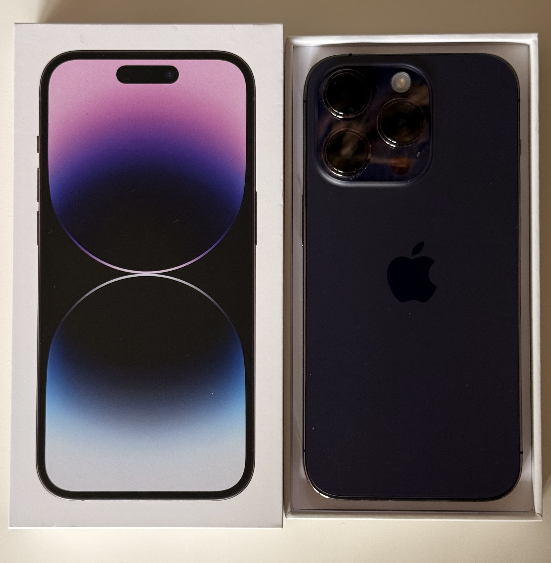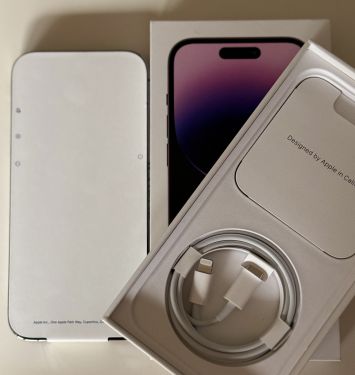 Se vende iPhone 14 Pro morado oscuro en perfecto estado, sin defectos. Incluye embalaje original, cable original y un cable extra de 2 metros, también original.