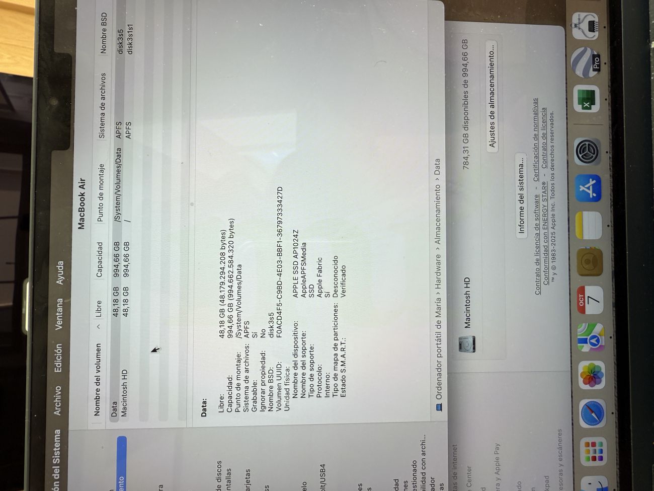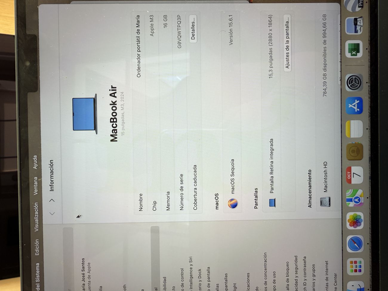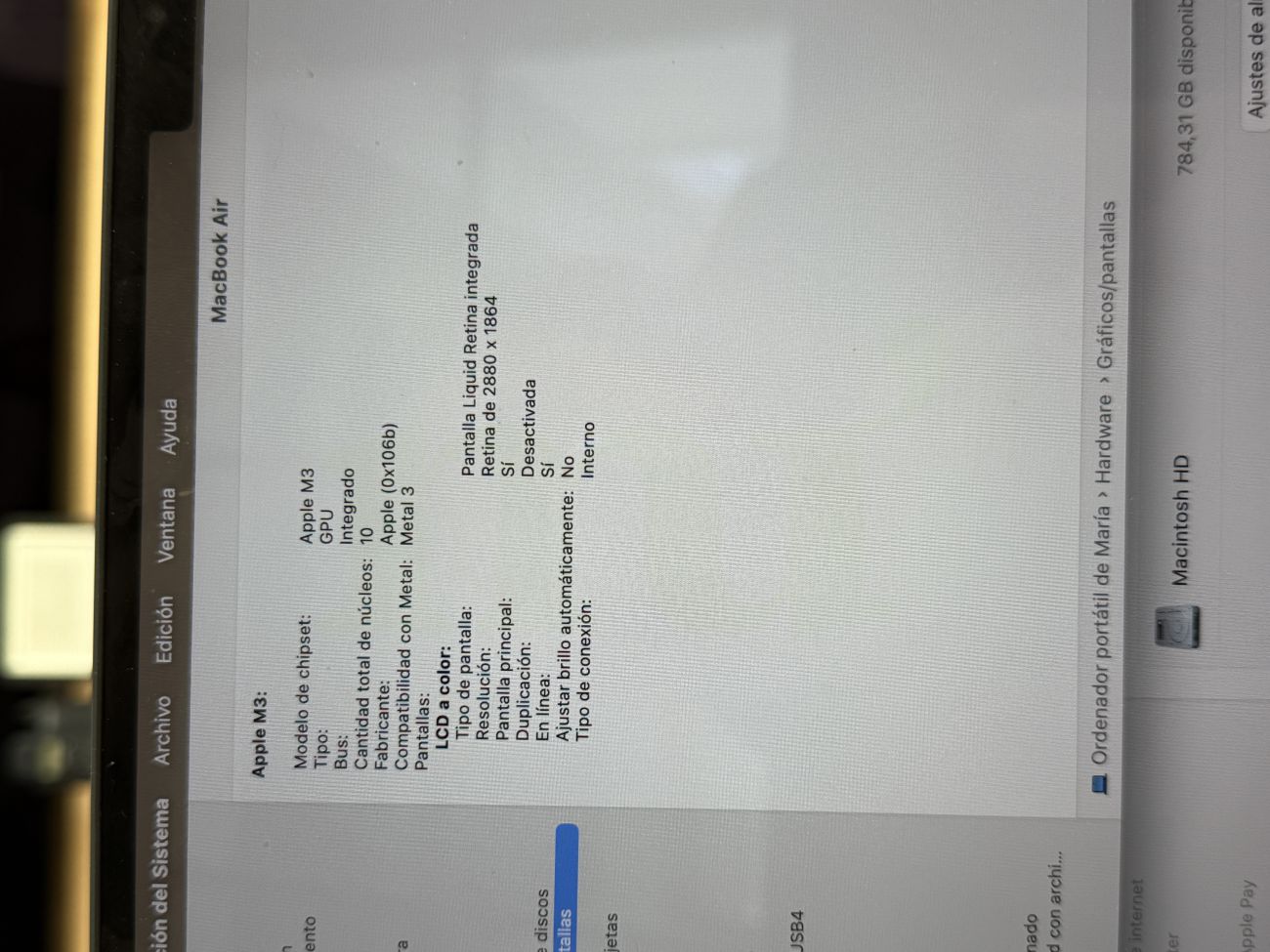 Macbook Air OJO!!! LA WEB NO ME DEJA METER LOS DATOS CORRECTOS. LA PANTALLA ES DE 15" , LA CAPACIDAD ES DE 1 TB. COMPRADO EN NOVIEMBRE DE 2024. EN PERFECTAS CONDICIONES. PRECIO EN TIENDA 2.289 €. G0VQWTPQ3P 58804