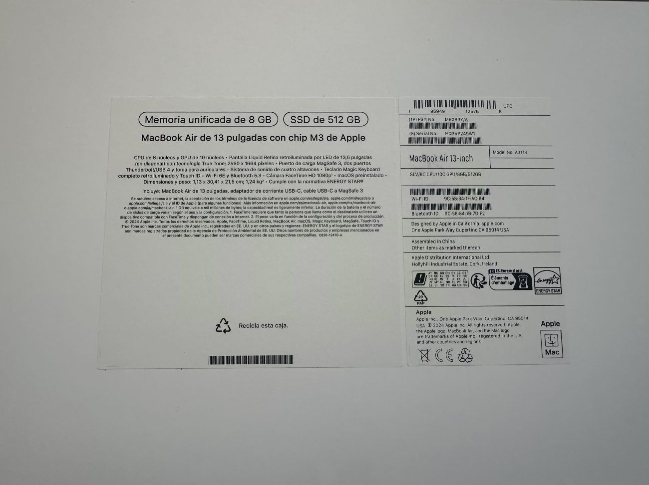 MacBook Air de 13 pulgadas con chip M3, modelo 2024. - Memoria SSD 512GB - Memoria unificada 8GB - Color plata. - Incluye cargador y caja - Esta como nuevo - Capacidad maxima de bateria 100%. Lo vendo por que por trabajo necesito mas memoria.