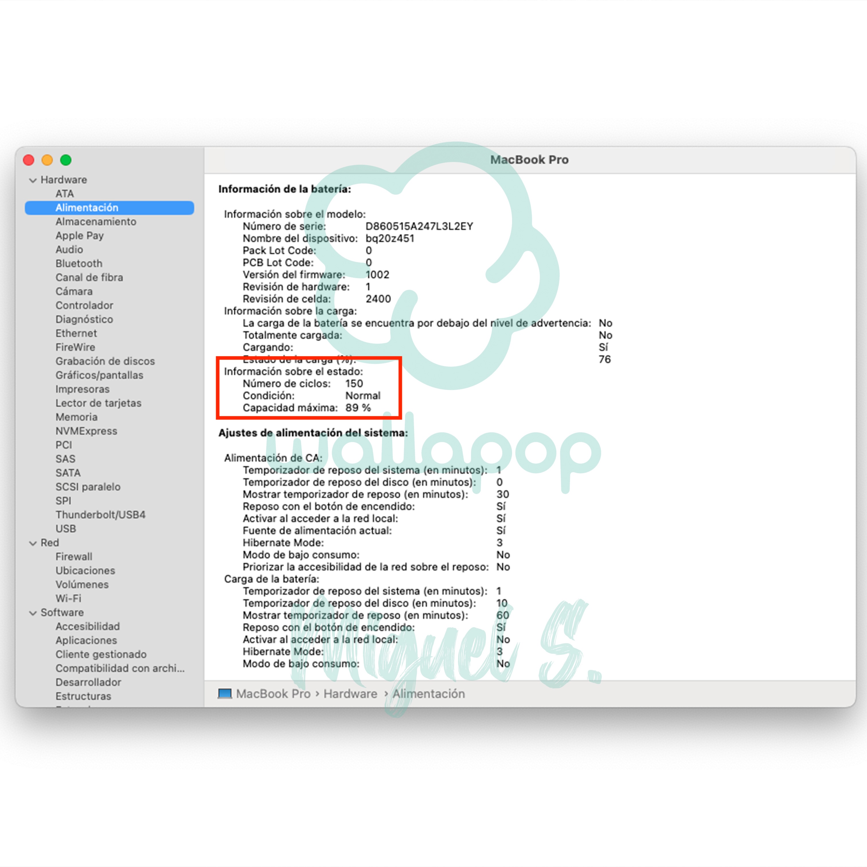 Actualmente el estado de la batería es bueno, con tan solo 150 ciclos de carga y un porcentaje de batería del 89% (aguanta varias horas sin cargar).