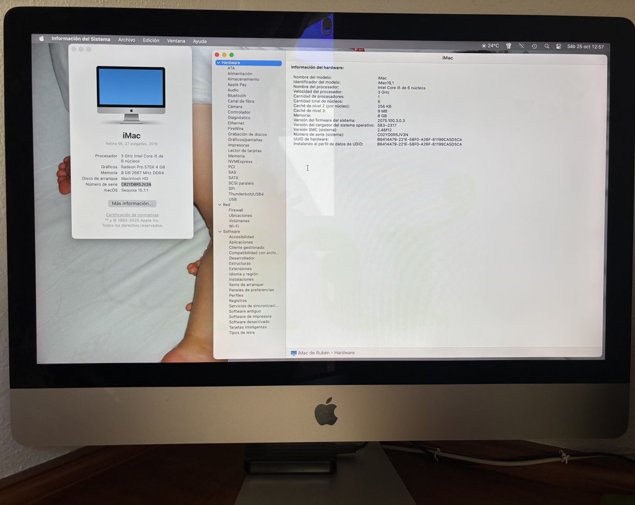 iMac 27" Retina 5K, 3.0 GHz Core i5, Radeon Pro 570X GPU, 1 TB Fusion, 8 GB RAM, en buenas condiciones y funcionando perfectamente, no se incluye ni teclado ni ratón.
