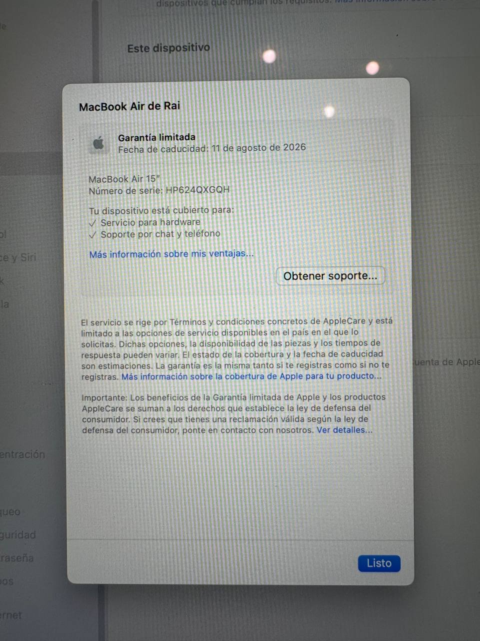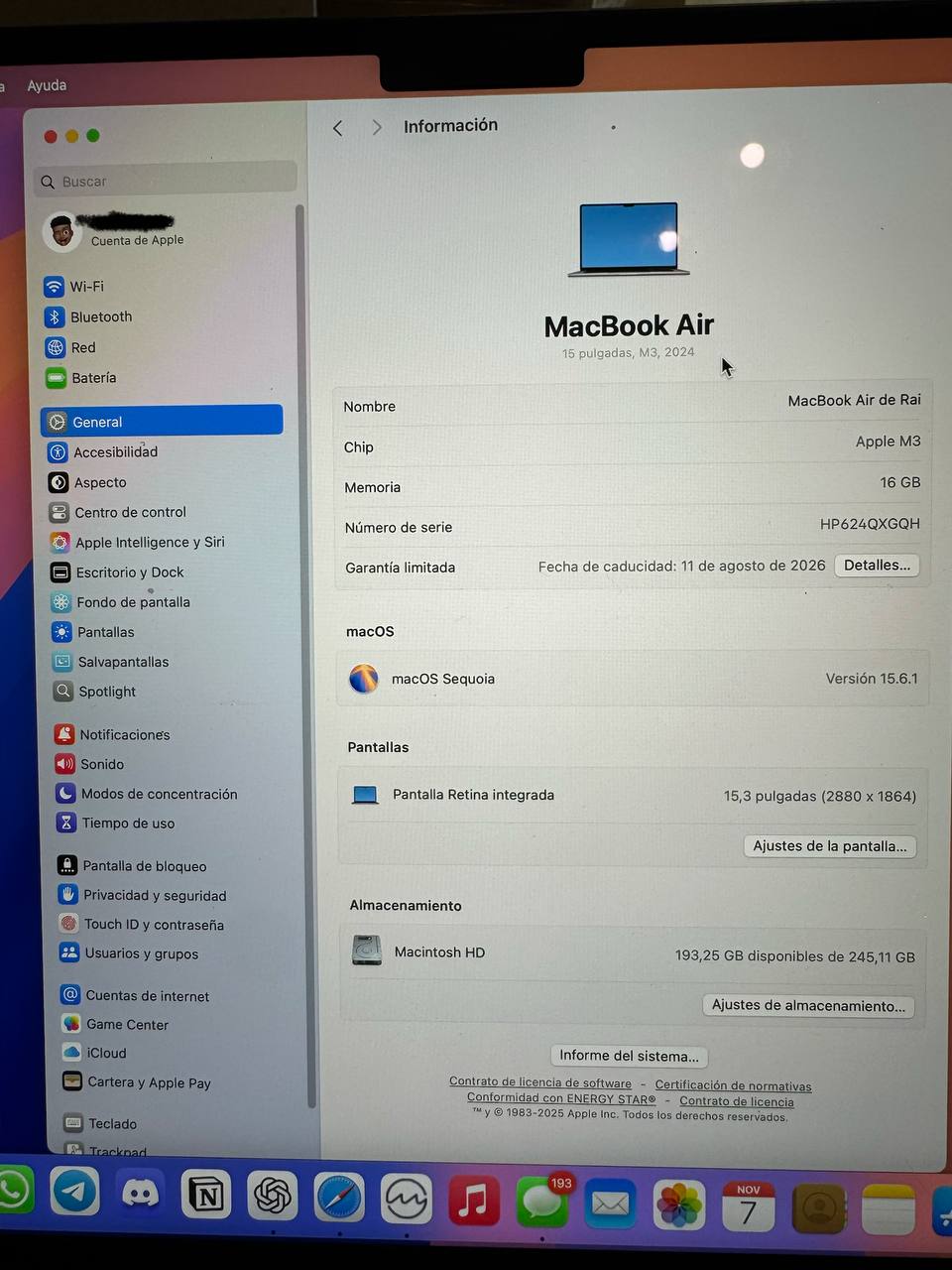 Vendo MacBook Air M3 de 15,3” gris espacial con 16 GB de RAM y 256 GB SSD. Perfecto estado, sin marcas ni arañazos, batería al 100 %, siempre usado en casa. Incluye caja original, cargador y cable oficiales. Modelo 2024, rápido, silencioso y con gran autonomía. Ideal para trabajo, estudios o edición.