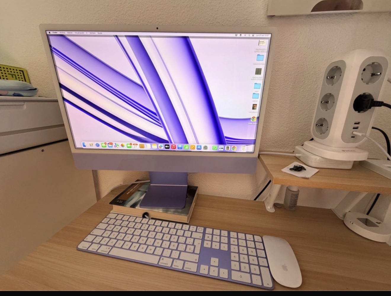 iMac de 24 pulgadas. Chip M3. Comprado en junio de 2024. Aún está en garantía. Tengo el ticket de compra. Muy poco uso. Se entrega en su caja junto con el ratón y teclado de español. Color lila malva.