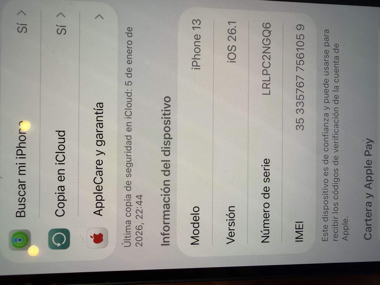 Iphone 13 comprado en 2022. Funciona perfectamente, ha tenido las cámaras siempre protegidas. Es de color azul y tiene algunas pequeñas marcas de desgaste del color en los laterales y dos pequeñas marcas en la parte superior que son impercepcibles con funda. Siempre ha llevado cristal templado. Lo vendo porque me han regalado otro. Lo único negativo es la salud de la batería, como se observa en las fotos.
