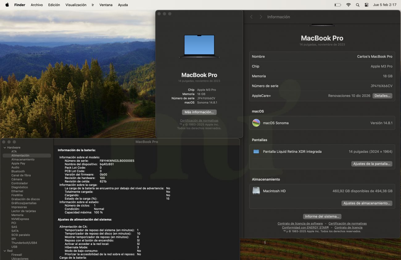Vendo Macbook Pro, modelo noviembre de 2023. Sin apenas uso. Bateria nueva y con APPLE CARE + Activo hasta Diciembre de 2026.