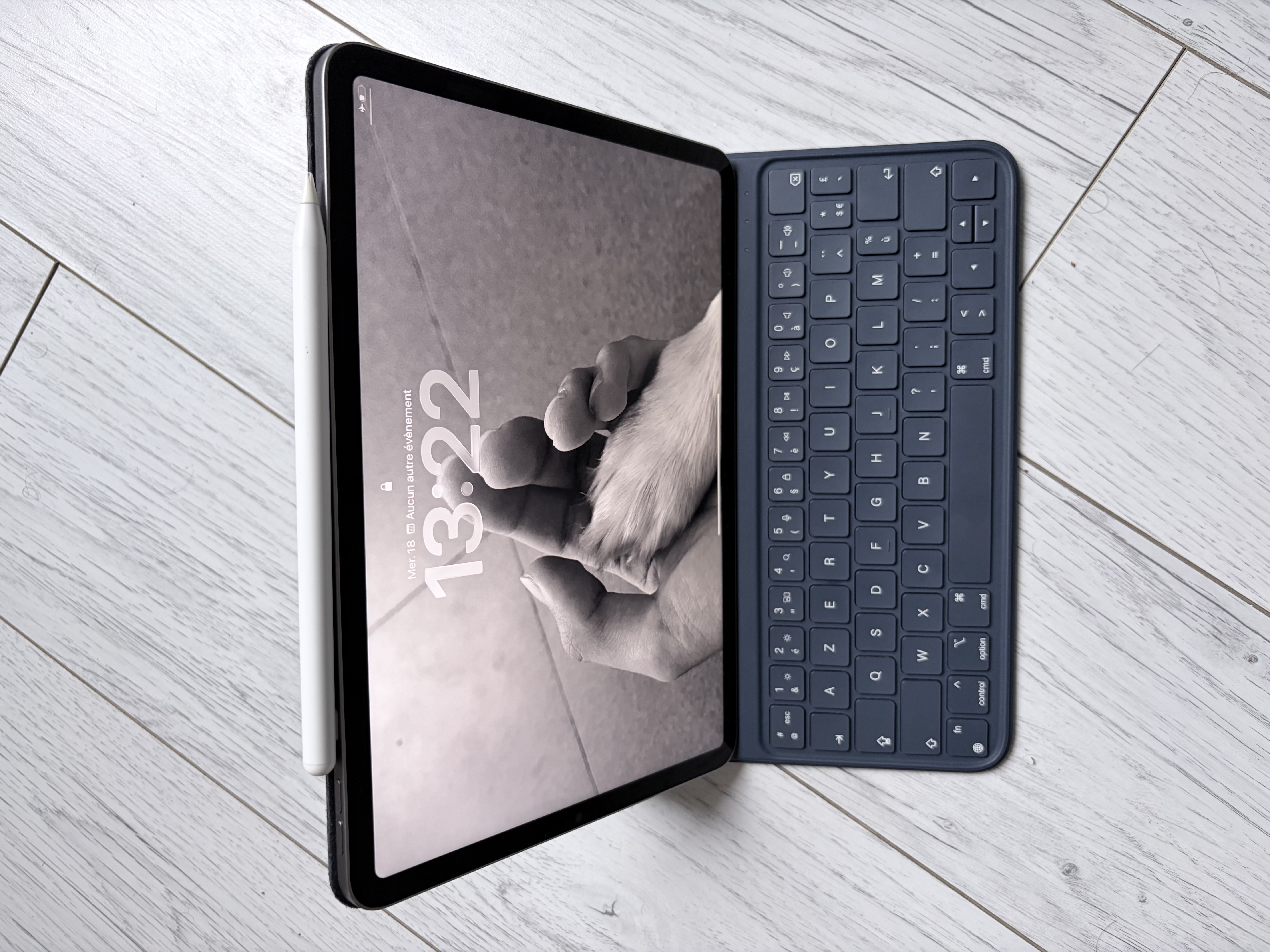 En su caja de origen, con una funda teclado y un lápiz.