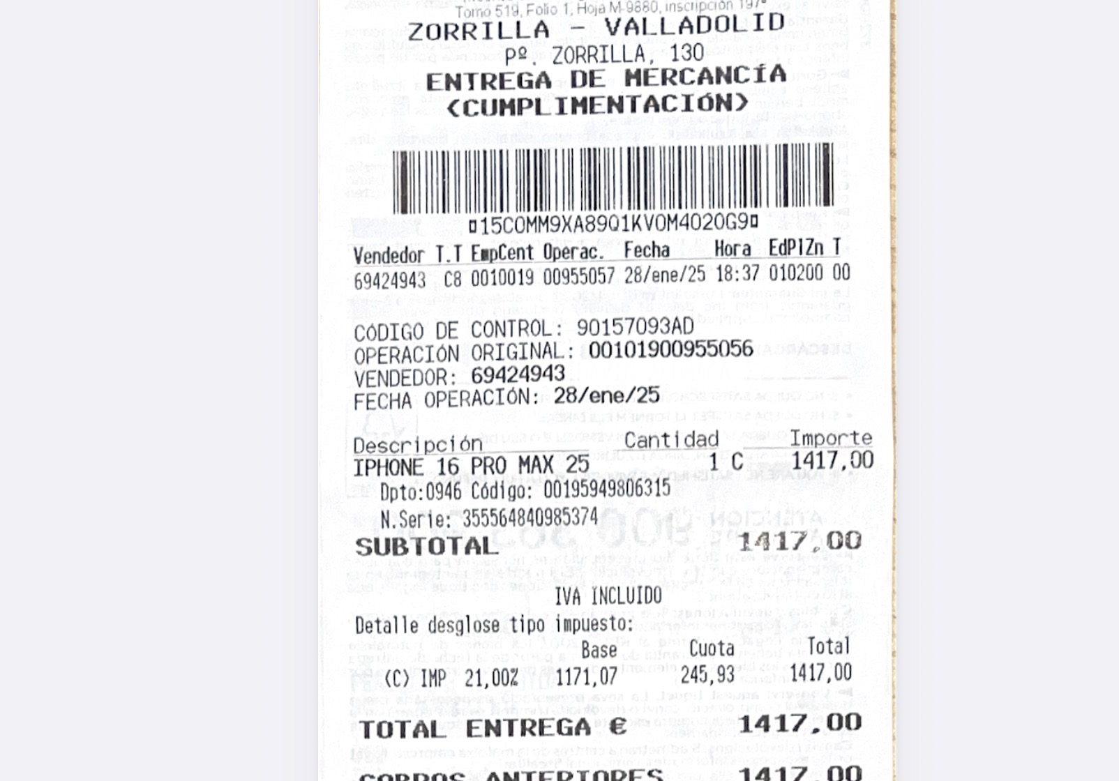 Se entrega copia ticket de compra del corte ingles para los casi dos años restantes de garantía.