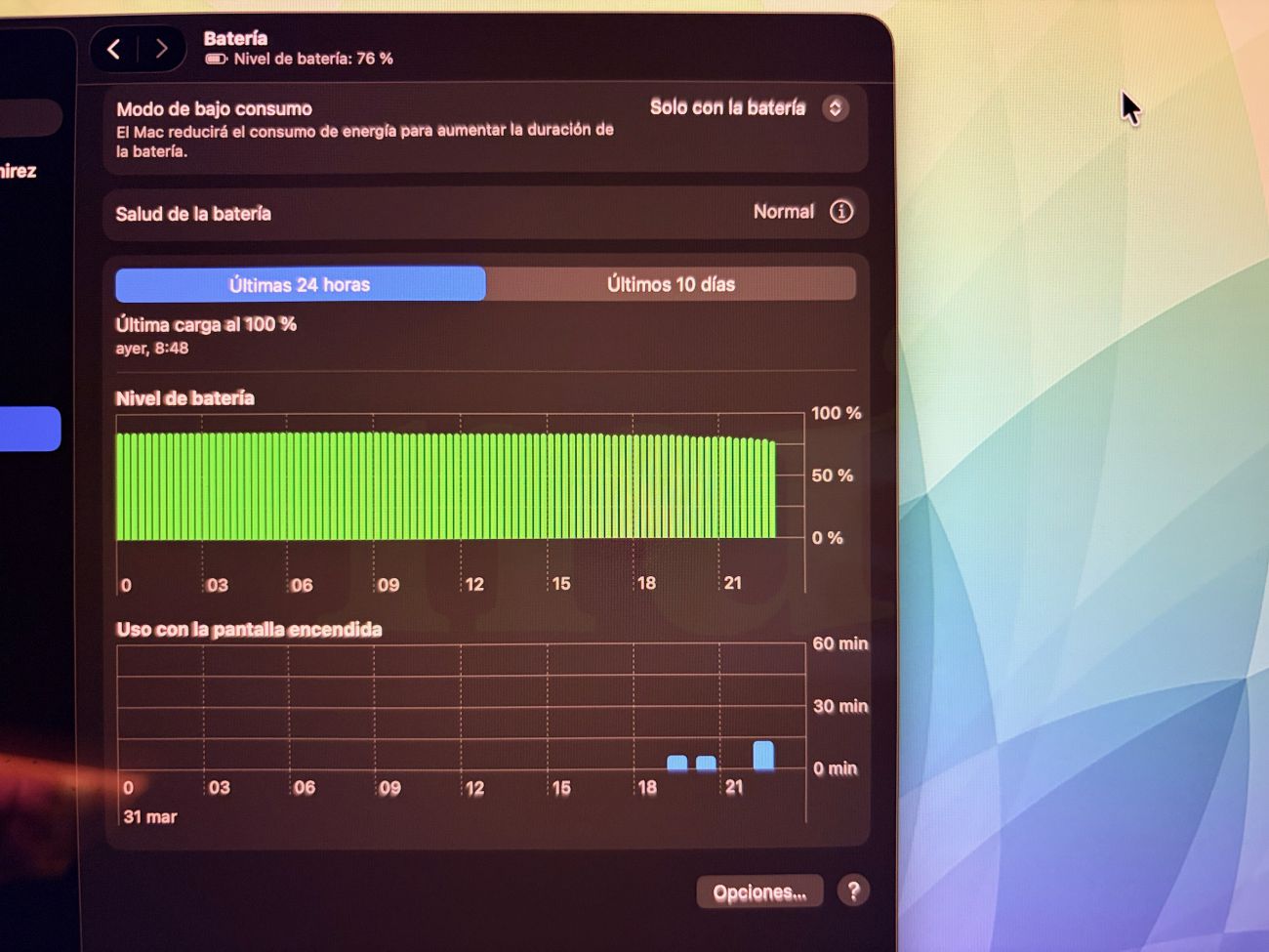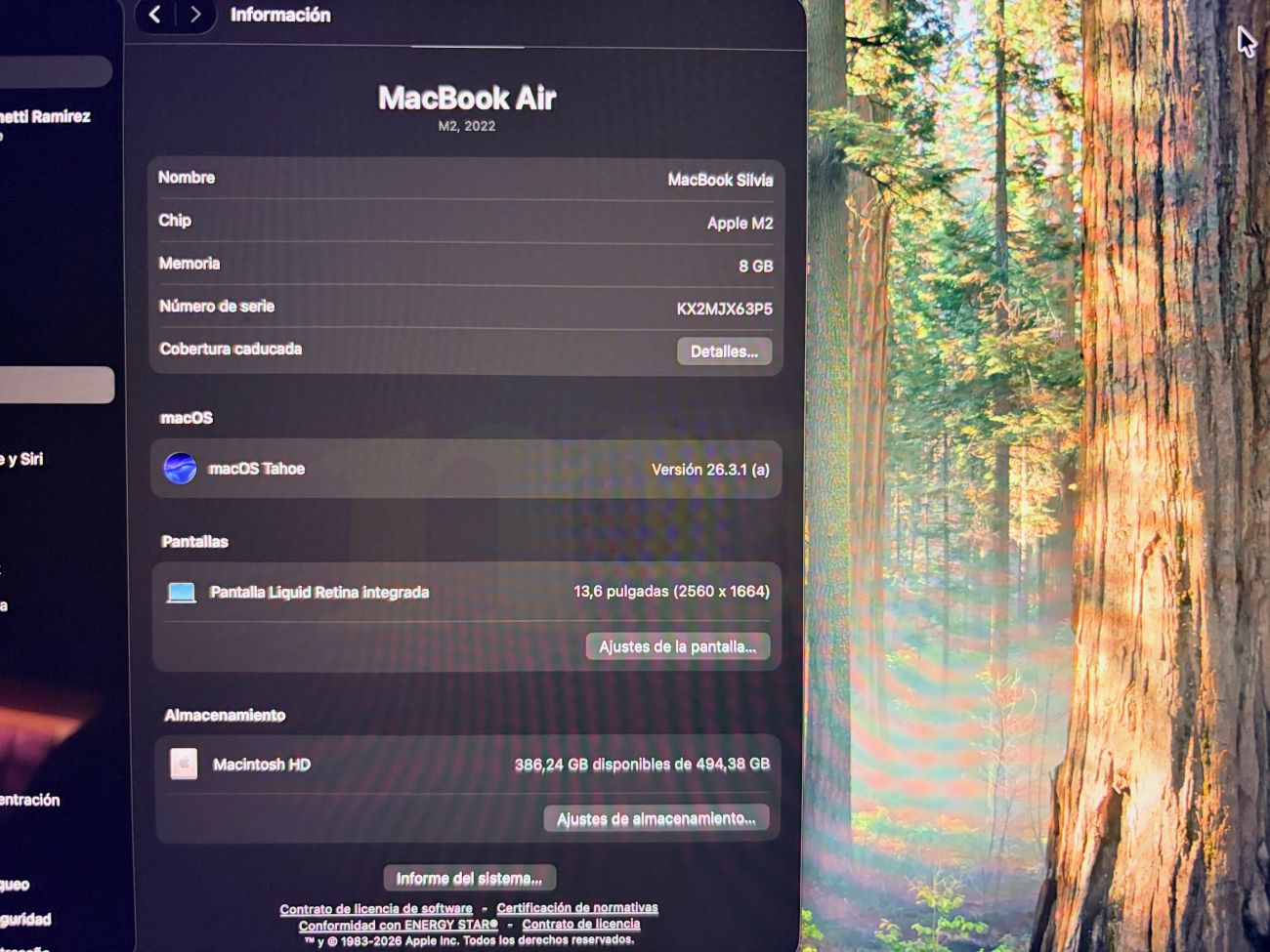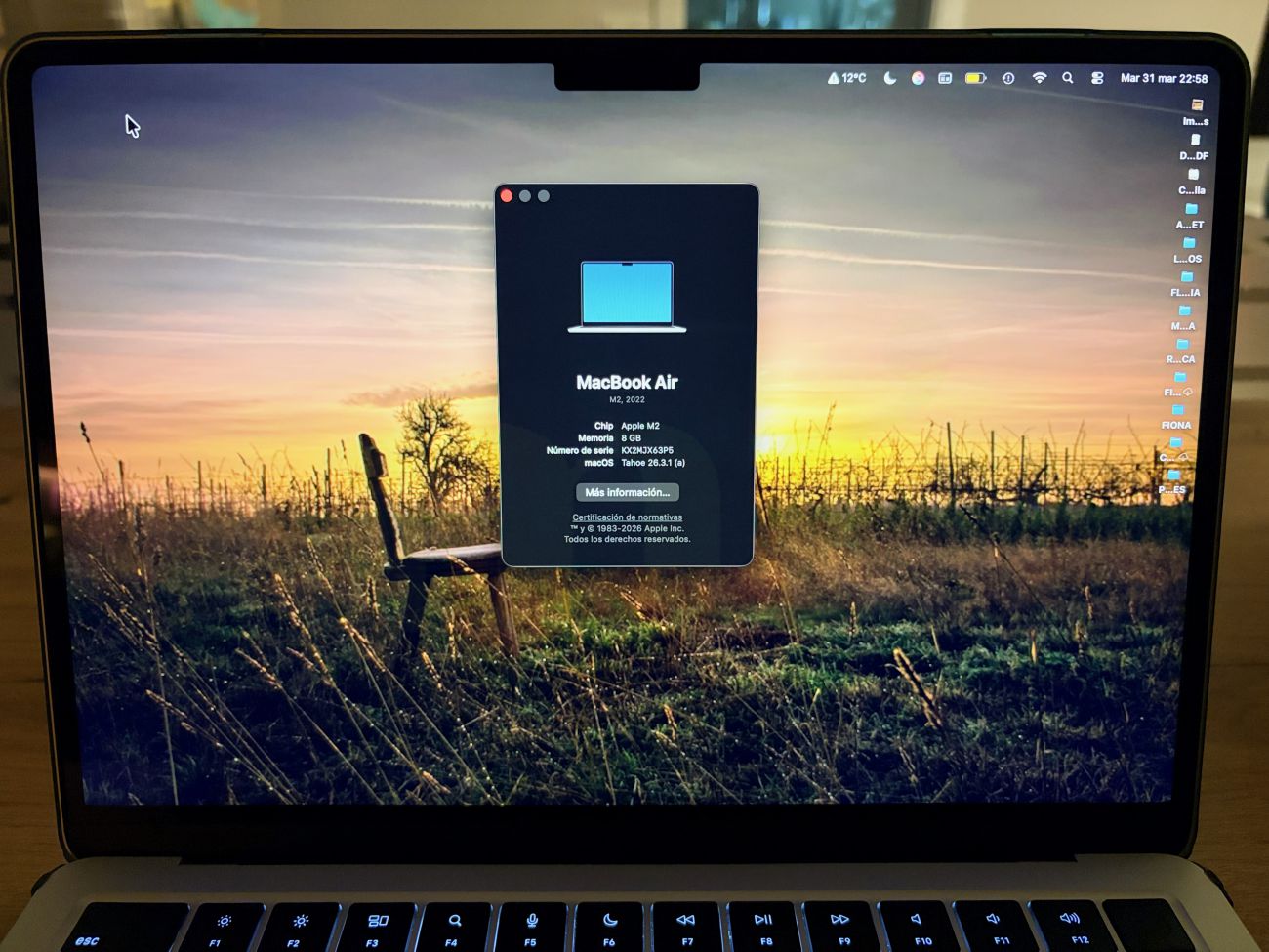 MacBook Air M2 con 8 GB RAM y 512 GB SSD, 13 pulgadas, color plata con Magsafe, 2 USB-C y conector auriculares; comprado en octubre de 2022; actualizado a Tahoe 26.4, justo después de la foto;
