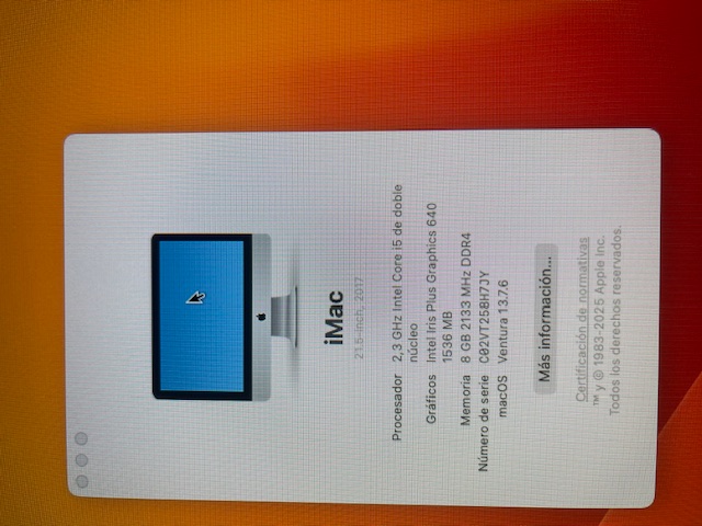iMac ???? Especificaciones:Procesador: 2,3 GHz Intel Core i5 (doble núcleo)Gráficos: Intel Iris Plus Graphics 640 (1536 MB)Memoria: 8 GB RAM DDR4 (2133 MHz)Sistema: macOS Ventura 13.7.6Número de serie: C02VT258HTJY⚙️ Estado:✔️ Enci C02VT258HTJY 59459