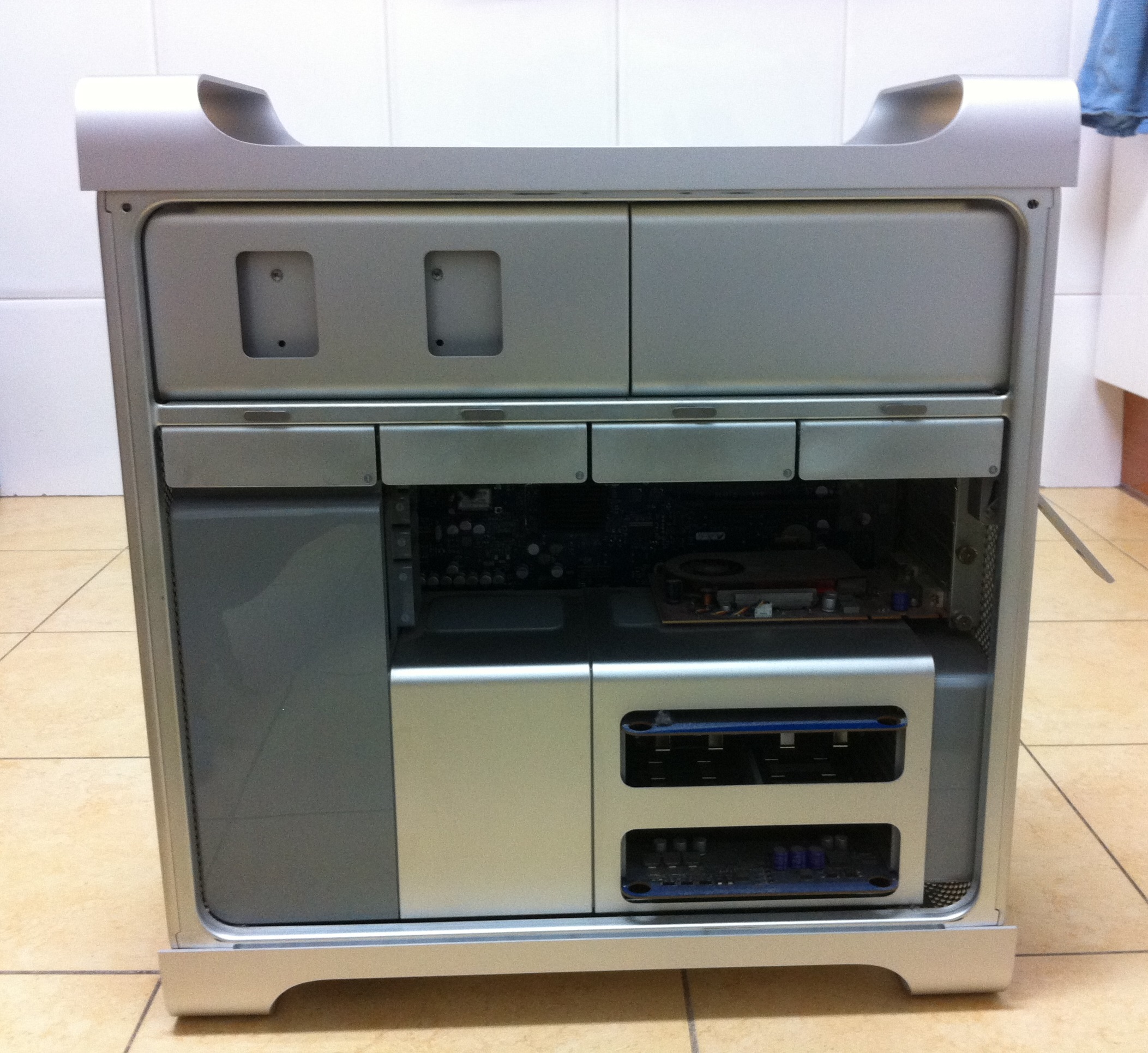 Hola. Perdona que haya tardado en responder. El estado de la torre es excelente, sin marcas que se puedan ver a simple vista. Sí que fijandose mucho puedes encontrar un par de puntitos (de aproximadamente un milimetro. Uno es el asa superior delantero. otro en el lateral derecho). Con una fuente de luz fuerte se puede ver alguna rallita muy fina en los laterales. He intentado hacer una foto pero no se ve. Para la edad que tiene el Mac, el estado es fenomenal.